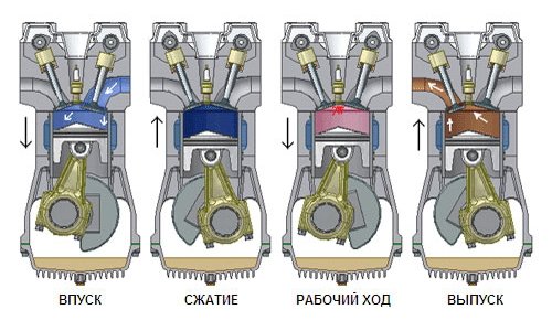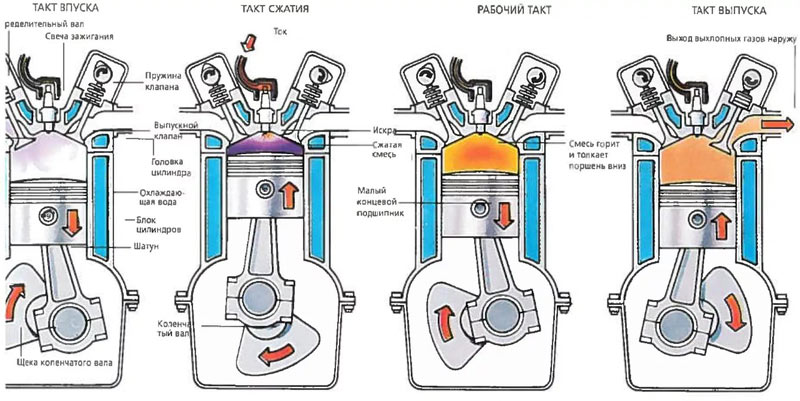 Работа бензинового двигателя, как и любого другого двигателя внутреннего сгорания заключается в сгорании топливной смеси в закрытом пространстве, в данном случае, в камере сгорания. При сгорании ТС выделяется большое количество тепловой энергии, которая запускает механическую работу основного механизма двигателя.